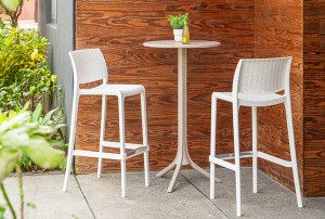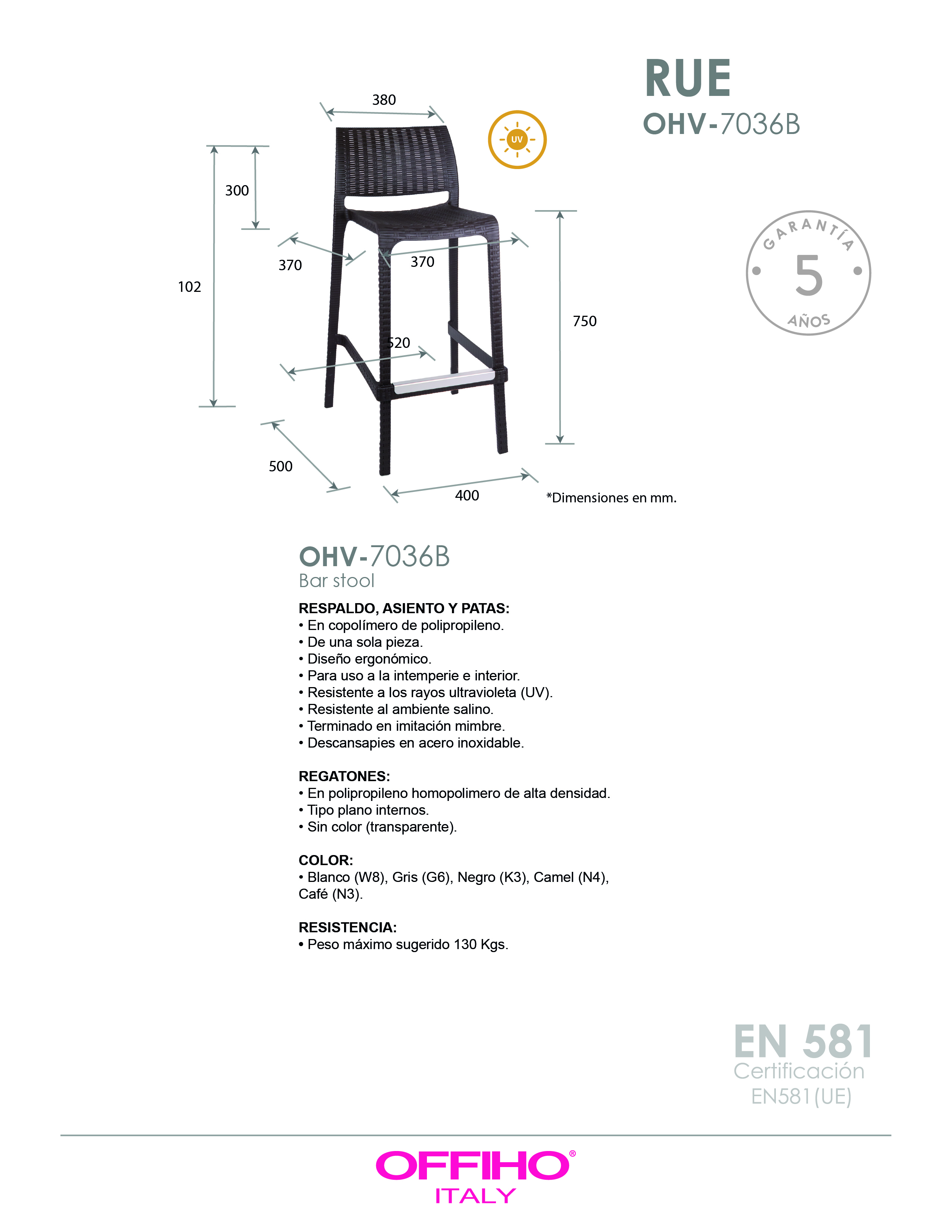 Patas, asiento y respaldo: de una sola pieza en polipropileno de alta resistencia y duración para intemperie, resistente a los rayos ultravioleta (UV) y al ambiente salino.