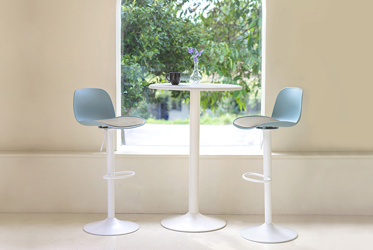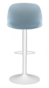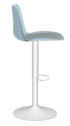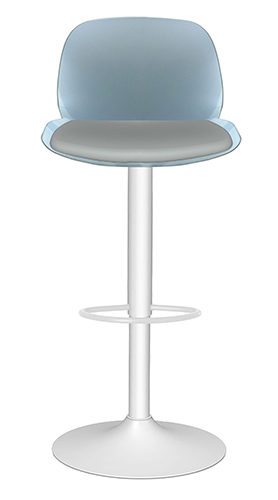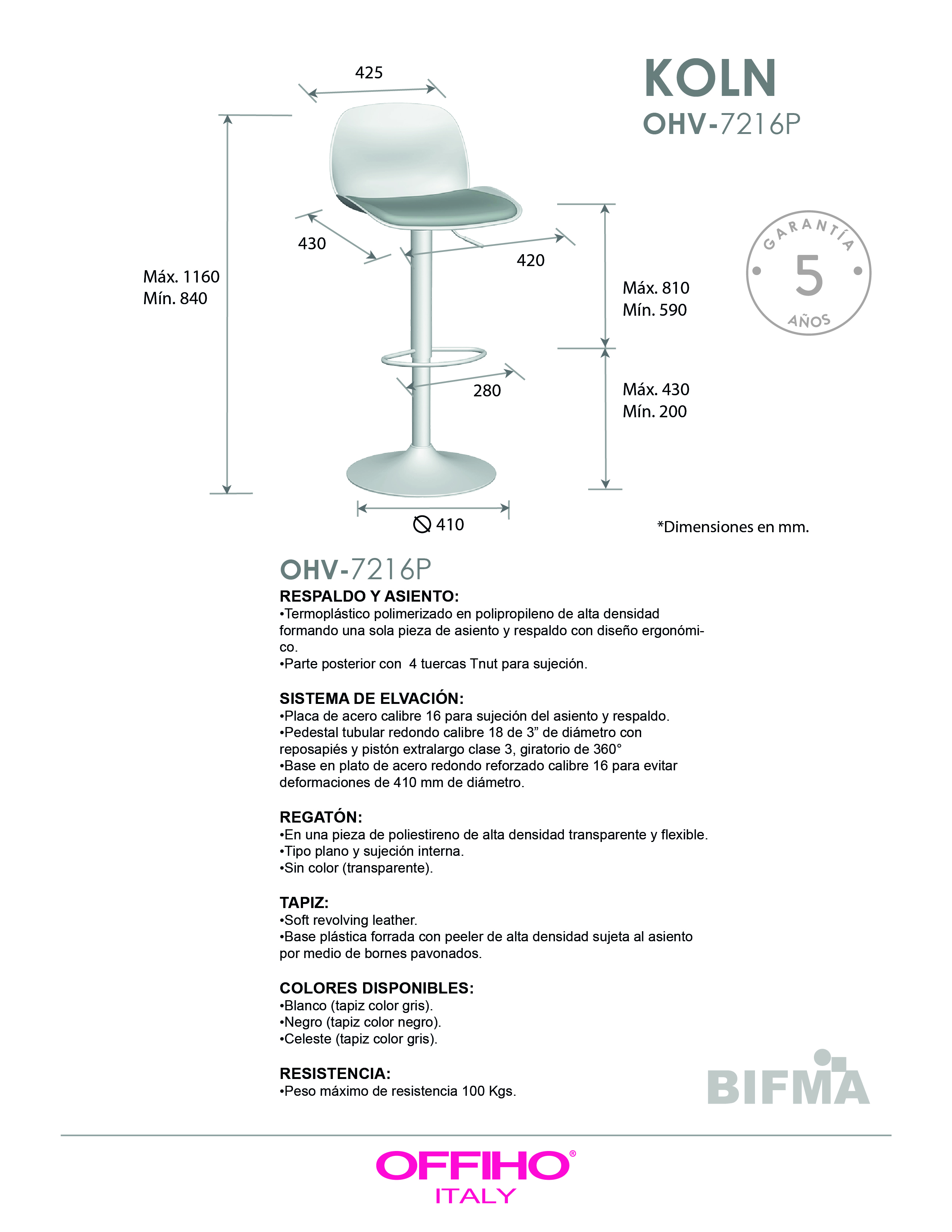 Base: plato redondo en lámina de acero calibre 18; pedestal tubular de aero redondo de 3" calibre 18. elevación: por medio de pistón neumático extralargo clase 3 que permite ajustar la altura del asiento. mecanismo: placa de acero reforzado con palanca de bloqueo y con descansapies. respaldo y asiento: de una sola pieza, termoplástico polimerizado en polipropileno de alta densidad. color: blanco (W9), azul niebla (B9) con blanco (W9) o negro (K5). tapiz: soft revolving leather gris para el blanco o celeste con blanco y soft revolving leather negro para el negro. resistencia: peso sugerido 100 kgs.