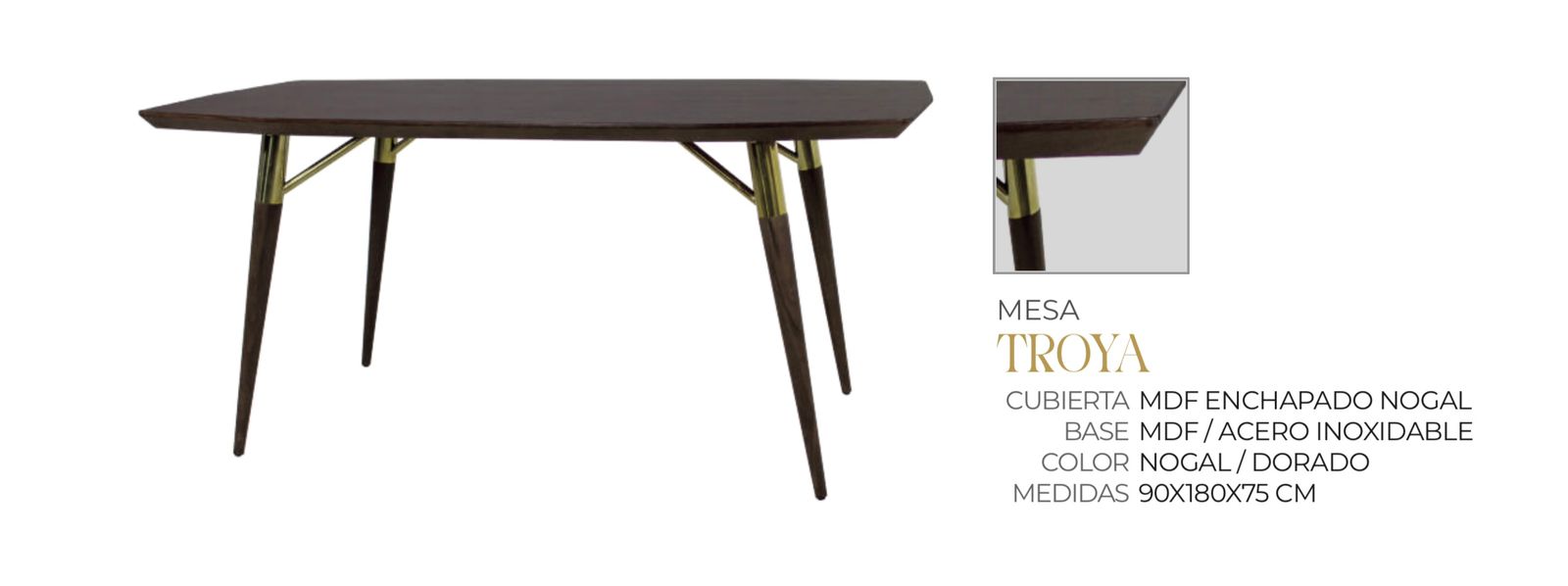 Mesa de Comedor Modelo TROYA en Nogal con Dorado