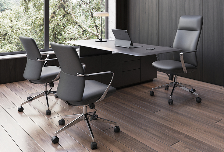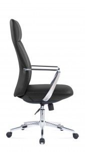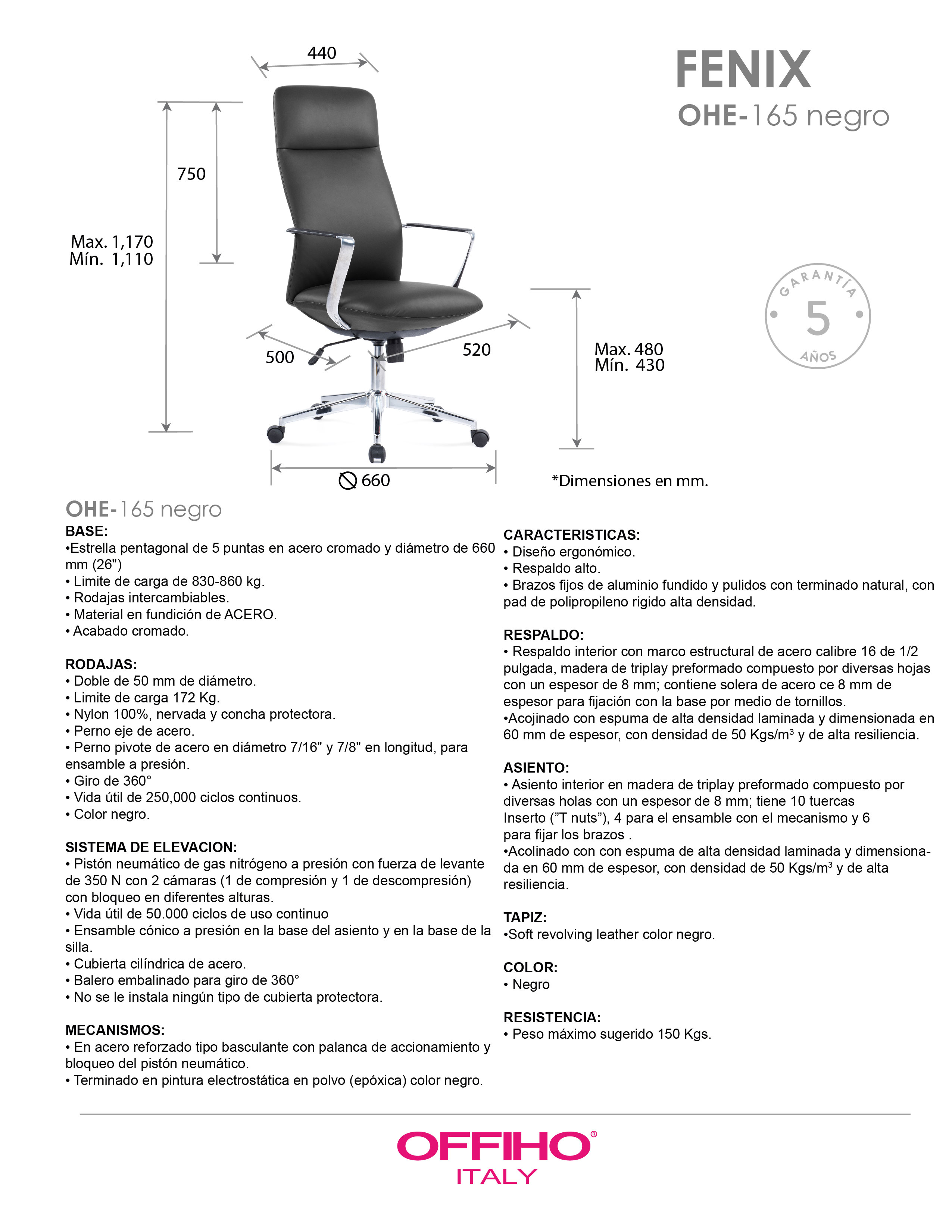 base: estrella de 5 puntas en acero fundido y cromado, rodajas tipo dual. elevación: por medio de pistón neumático que permite ajustar la altura del asiento. mecanismo: en solera de acero tipo basculante con sistema de reclinación y palanca de bloqueo, perilla de regulación de tensión para el sistema de reclinación y palanca de bloqueo para la inclinación del respaldo. brazos: de aluminio fundido y pulidos con terminado natural, con pad de polipropileno rígido de alta resistencia. respaldo: respaldo alto con estructura de acero y base de madera acojinado con hule espuma laminada flexible con densidad de 50 kgs/m³ y alta resiliencia. asiento: base de madera acojinado con hule espuma laminada flexible con densidad de 50 kgs/m³ y alta resiliencia. tapiz: en soft revolving leather de color negro. peso máximo de resistencia: 150 kgs. aproximadamente.