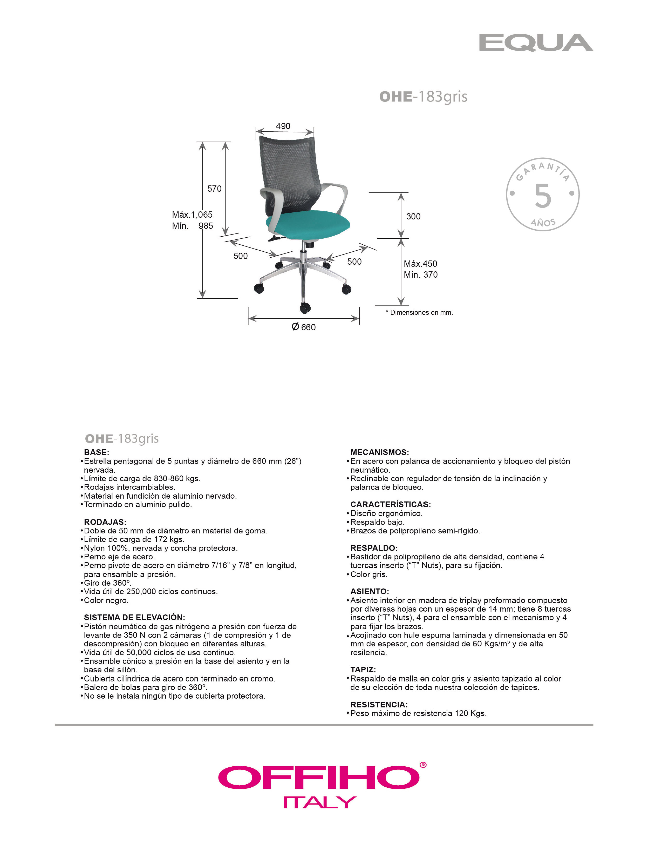 elevación: por medio de pistón neumático que permite ajustar la altura del asiento.