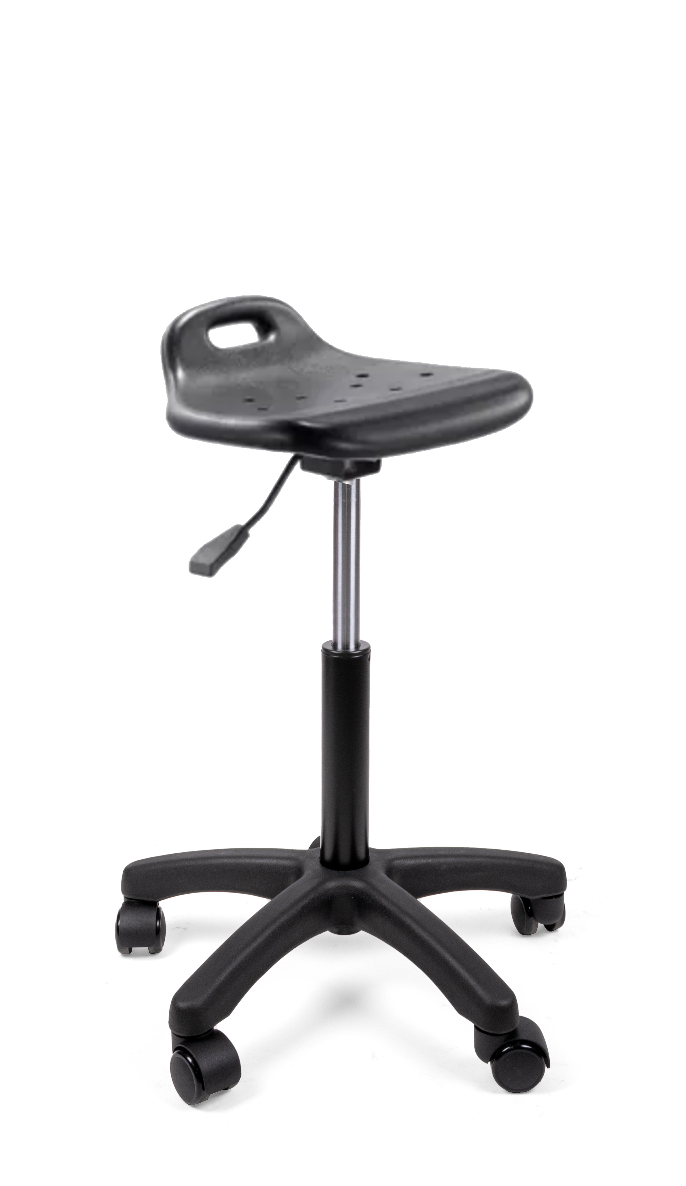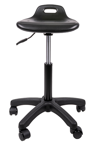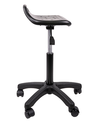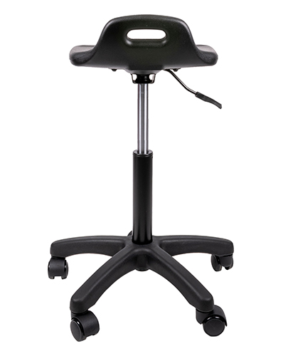 base: estrella de 5 puntas en poliamida, rodajas tipo dual. elevación: por medio de pistón neumático tipo cajero que permite ajustar la altura del asiento. mecanismo: plato de acero reforzado con palanca de accionamiento y bloqueo del pistón neumático. asiento: poliuretano compacto suave de uso industrial con interior en madera de aglomerado y curvatura antropométrica. peso máximo de resistencia: 120 kgs. NOTA: Las medidas de las alturas aumentan 240 mm con kits cajeros.