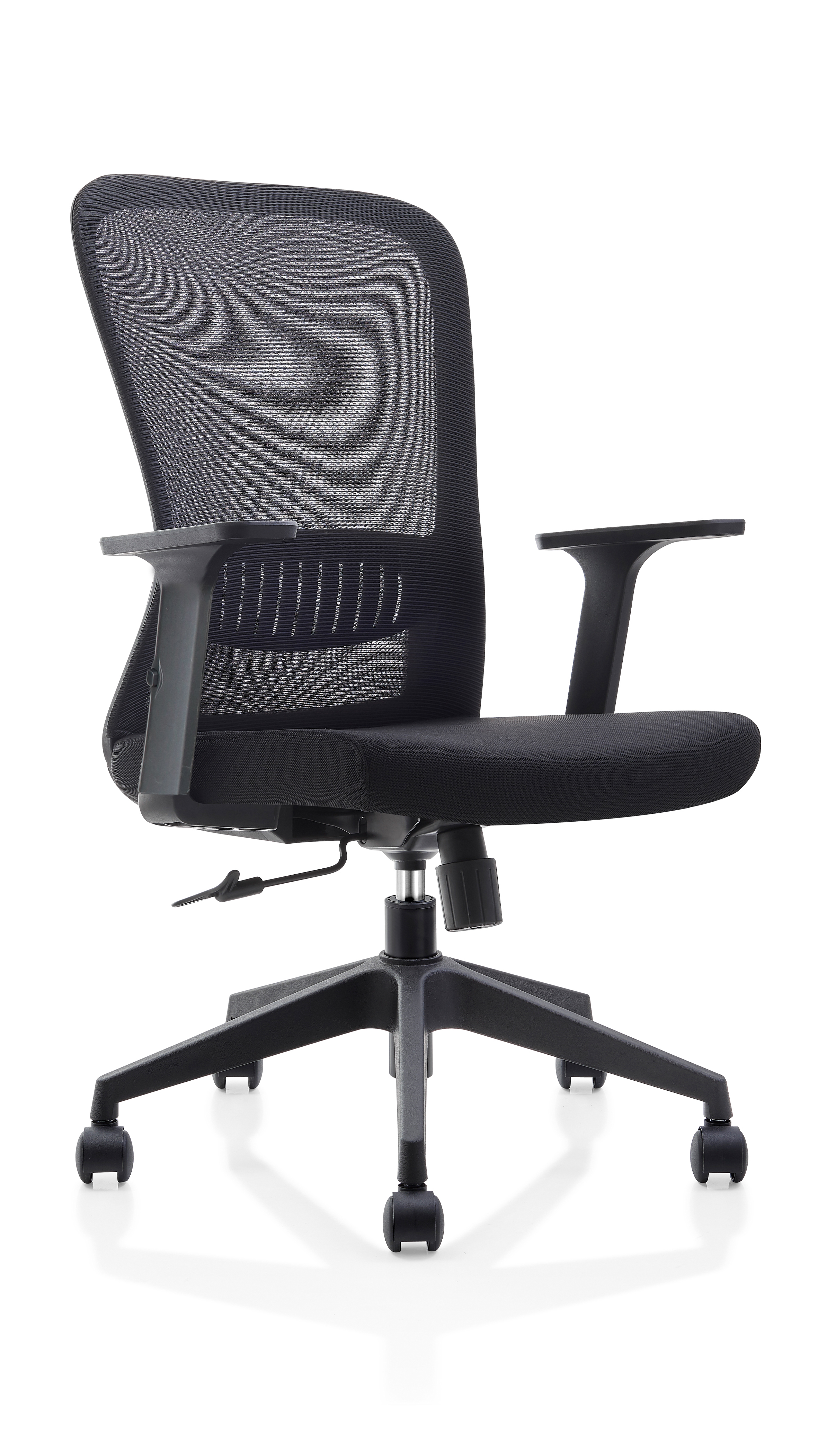base: estrella de 5 puntas en poliamida, rodajas tipo dual. elevación: por medio de pistón neumático que permite ajustar la altura del asiento. mecanismo: plato de acero reforzado con sistema de reclinación y palanca de bloqueo, perilla de regulación de tensión para el sistema de reclinación. brazos: de polipropileno semi-rígido con pad de poliuretano, ajustables de 5 posiciones. respaldo: en malla de diseño ergonómico con soporte lumbar ajustable y cabecera ajustable. asiento: hule espuma laminado flexible con densidad de 40 kgs/m3 con retardante a la flama y alta resiliencia. tapiz: respaldo de malla de color negro y asiento en tela 100% POLIESTER COLOR NEGRO, FUNDA TAPIZADA Y PESPUNTADA. peso máximo de resistencia: 120 kgs.