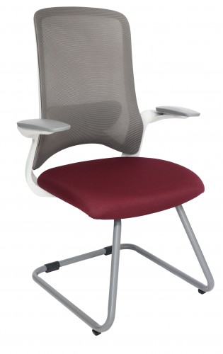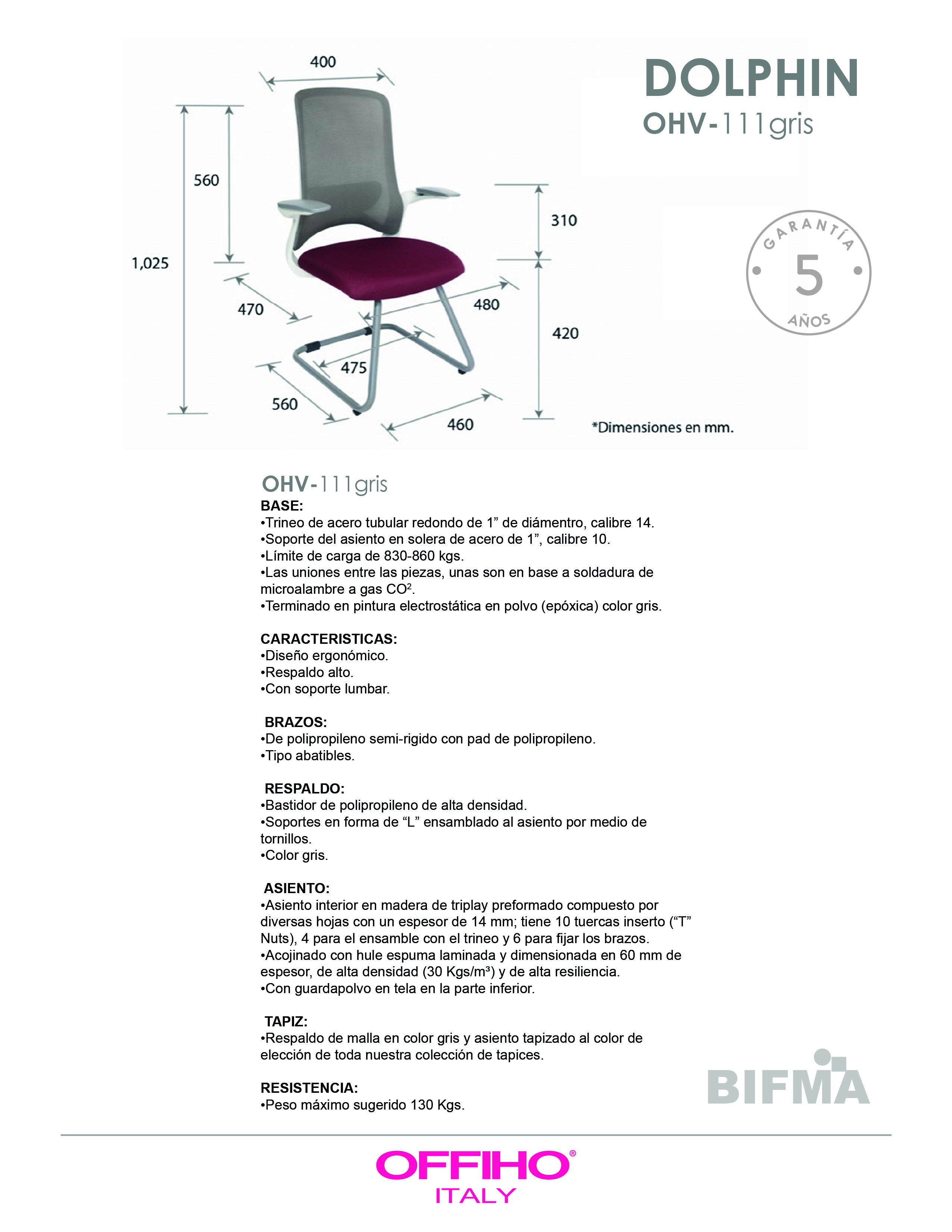 estructura: tipo trineo de acero tubular de 1" de diámetro, calibre 14; con acabado en pintura epóxica (electrostática) color gris. brazos: abatibles de polipropileno. respaldo: en malla de diseño ergonómico. asiento: hule espuma laminado flexible con densidad de 30 kgs/m³ y alta resiliencia. tapiz: respaldo de malla de color gris y asiento tapizado al color de su elección de toda nuestra colección de tapices. peso máximo de resistencia: 130 kgs.