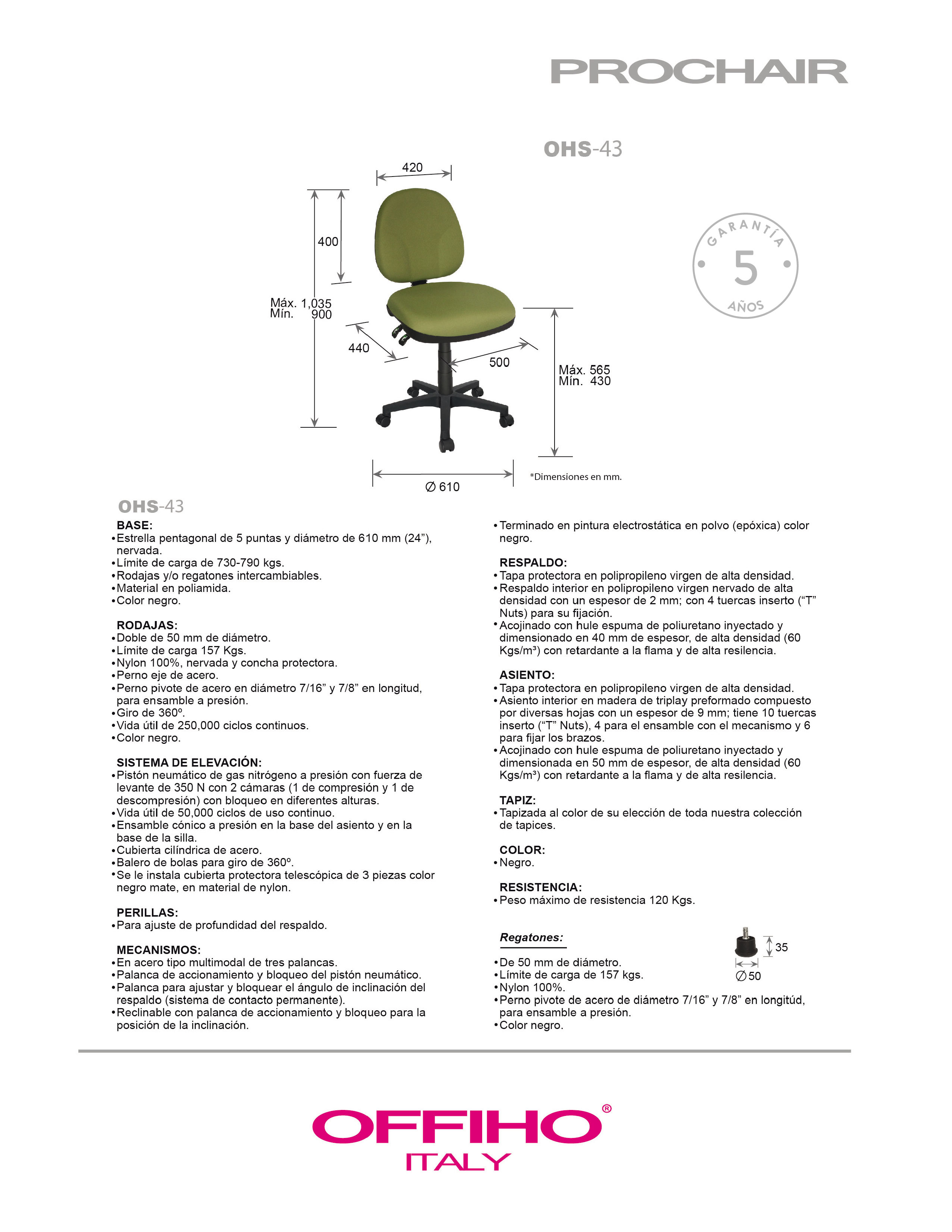 base: de 5 puntas en poliamida, rodajas tipo dual y/o regatones. elevación: por medio de pistón neumático que permite ajustar la altura del asiento. perillas de ajuste: para ajustar la altura del respaldo. mecanismo: en acero tipo multimodal de tres palancas; una para el accionamiento y bloqueo del pistón neumático, otra para ajustar y bloquear el ángulo de inclinación del respaldo (sistema de contacto permanente) y la última acciona y bloquea la posición de la inclinación del reclinaje. asiento y respaldo: hule espuma de poliuretano inyectado con densidad de 60 kgs/m3 con retardante a la flama y alta resiliencia. tapiz: tapizada al color de su elección de toda nuestra colección de tapices. peso máximo de resistencia: 120 kgs.