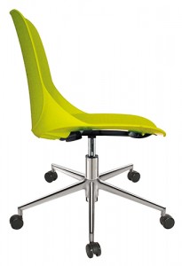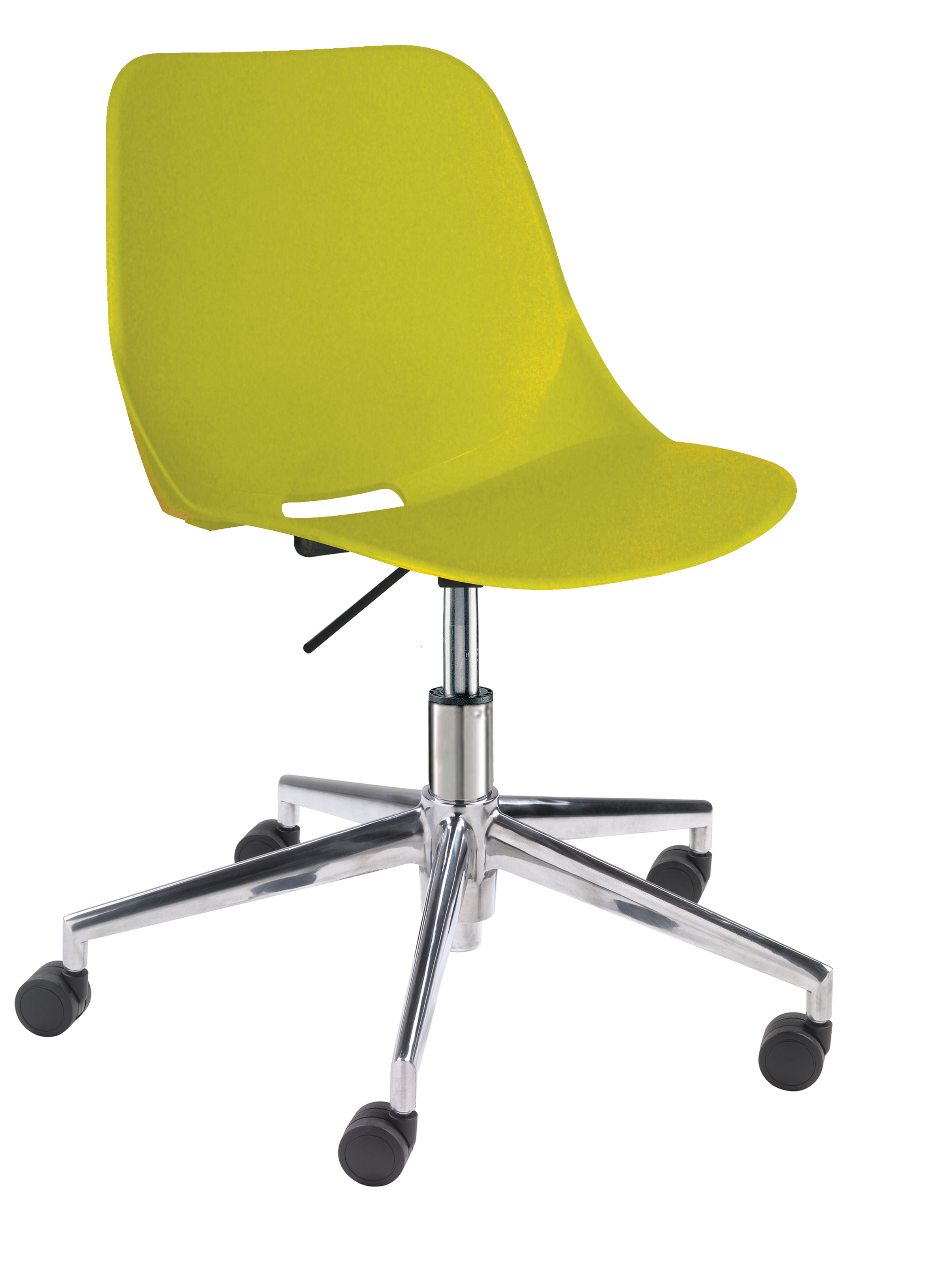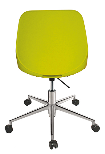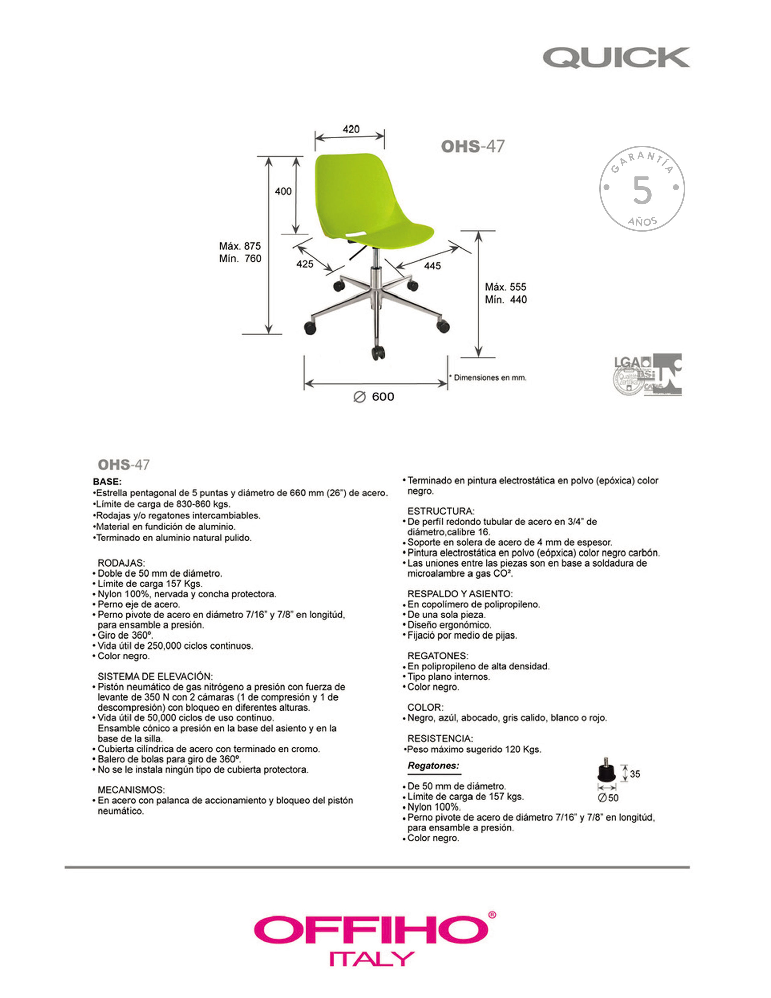 base: estrella de 5 puntas en aluminio fundido y pulido, rodajas tipo dual y/o regatones. elevación: por medio de pistón neumático con terminado en cromo que permite ajustar la altura del asiento. mecanismo: plato de acero reforzado con palanca de accionamiento y bloqueo del pistón neumático. asiento y respaldo: de una sola pieza en polipropileno de alta resistencia y duración. color: negro, azul, abocado, blanco, rojo o gris cálido. peso máximo de resistencia: 120 kgs. NOTA: Las medidas de las alturas aumentan 240 mm con kits cajeros.