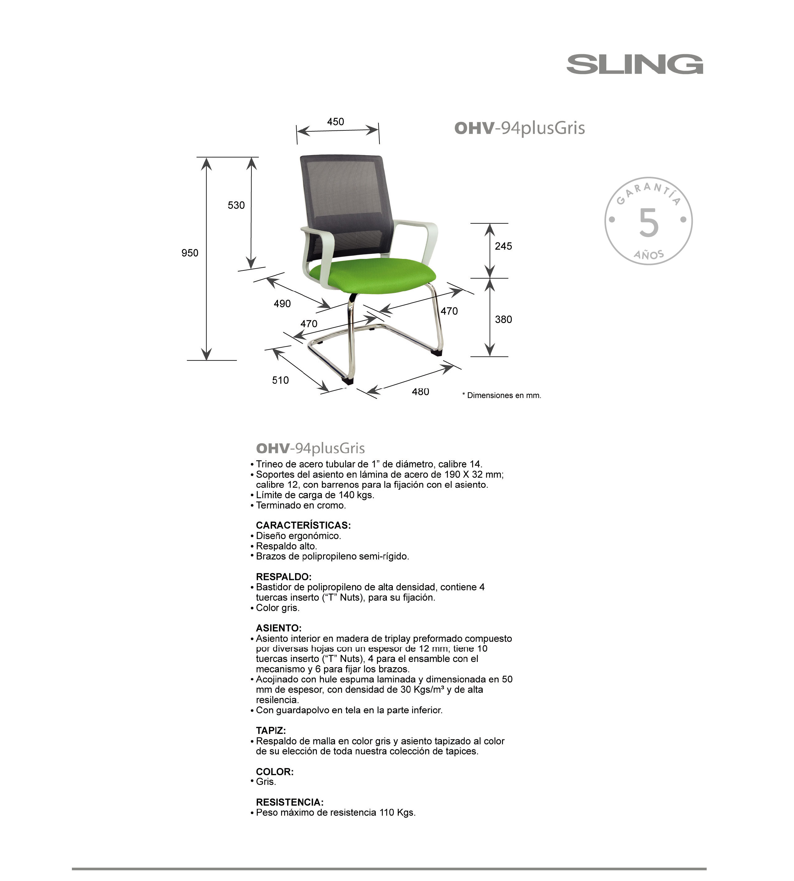 base: trineo de acero tubular redondo de 1" de diámetro, calibre 14; con terminado en cromo. respaldo: en malla de diseño ergonómico. asiento: hule espuma laminado flexible con densidad de 30 kgs/m3 y alta resistencia. tapiz: respaldo de malla de color gris y asiento tapizado al color de su elección de toda nuestra colección de tapices. peso máximo de resistencia: 110 kgs.