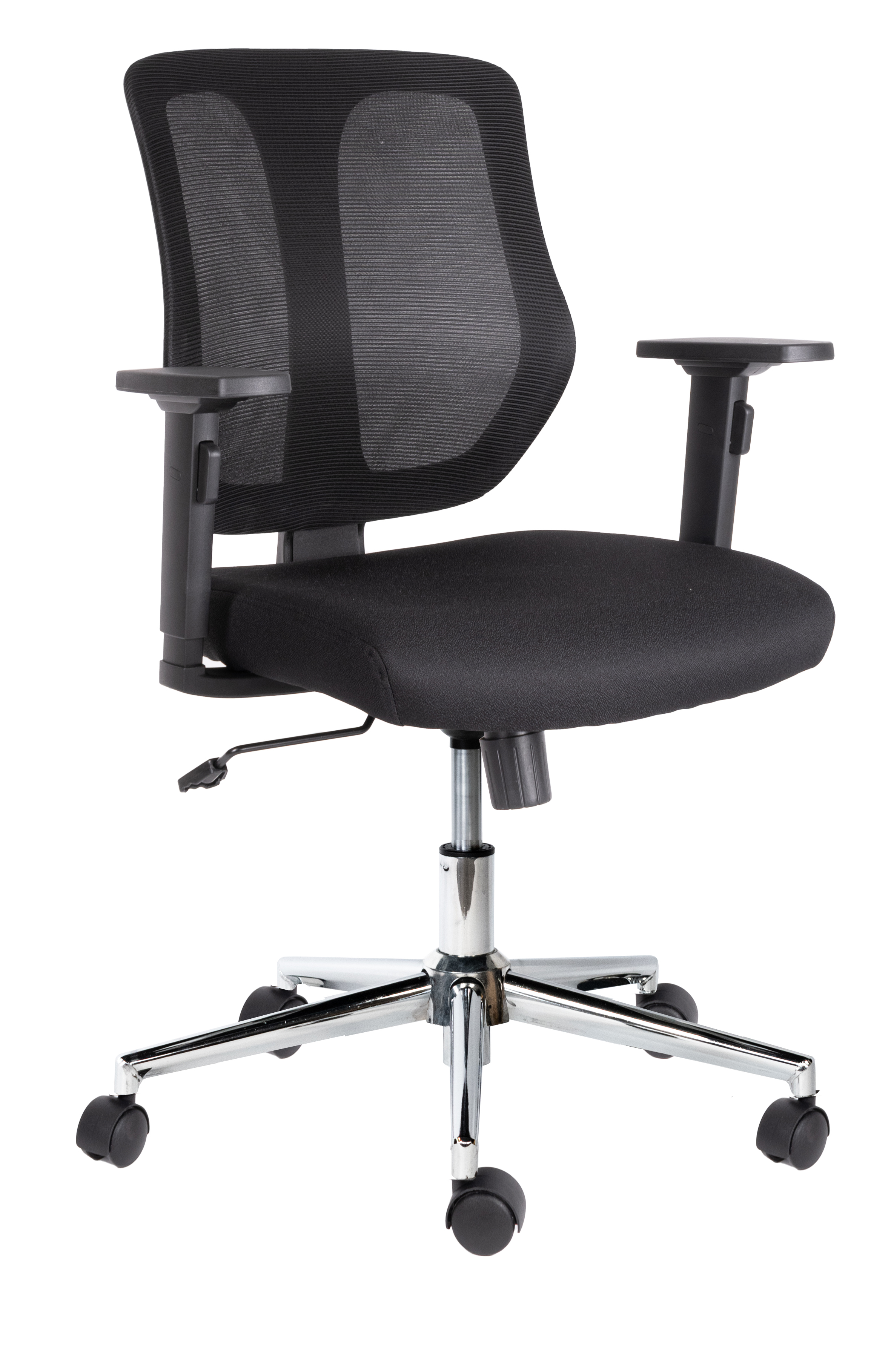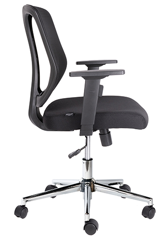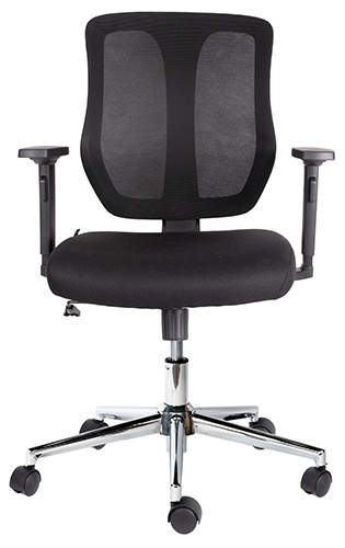 base: estrella de 5 puntas en acero cromado, rodajas tipo dual. elevación: por medio de pistón neumático que permite ajustar la altura del asiento. mecanismo: plato de acero reforzado con sistema de reclinación y palanca de bloqueo, perilla de regulación de tensión para el sistema de reclinación. brazos: de polipropileno rígido ajustables de 6 posiciones. respaldo: en malla de diseño ergonómico. asiento: hule espuma laminado flexible con retardante a la flama, densidad de 35 kgs/m3 y alta resiliencia. tapiz: respaldo de malla de color negro y asiento en tela 100% POLIESTER COLOR NEGRO, FUNDA TAPIZADA Y PESPUNTADA. peso máximo de resistencia: 120 kgs. aproximadamente.