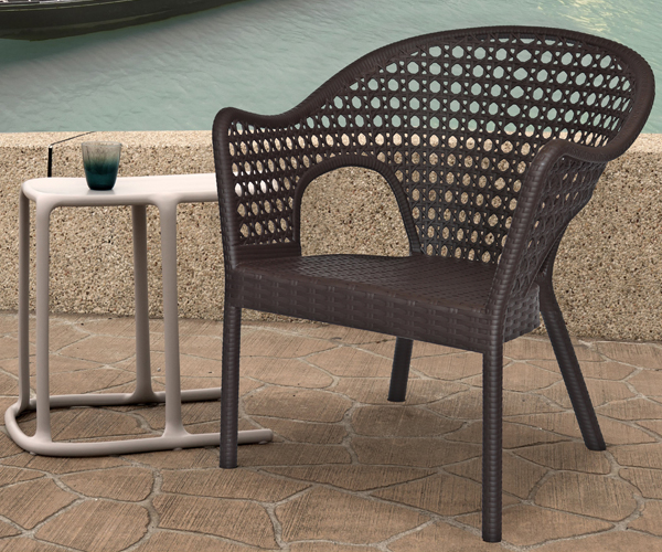 respaldo, asiento y patas: terminado en imitación mimbre de una sola pieza en polipropileno de alta resistencia y duración para intemperie, resistente a los rayos ultravioleta (UV) y al ambiente salino.