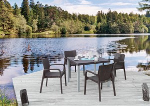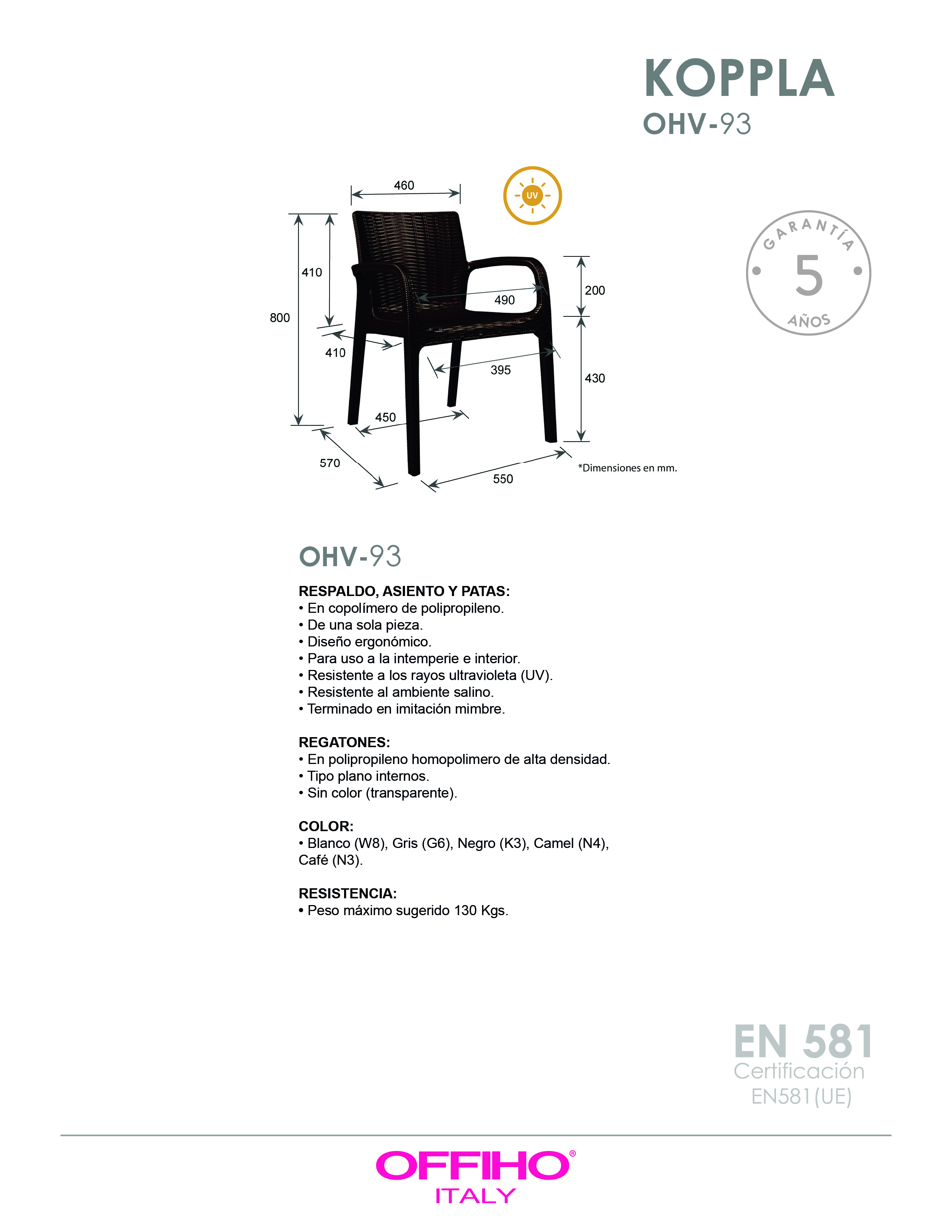 respaldo, asiento y patas: terminado en imitación mimbre de una sola pieza en polipropileno de alta resistencia y duración para intemperie, resistente a los rayos ultravioleta (UV) y al ambiente salino. color: blanco (W8), gris (G6), negro grafito (K3), café (N3) resistencia: peso sugerido 130 kgs.