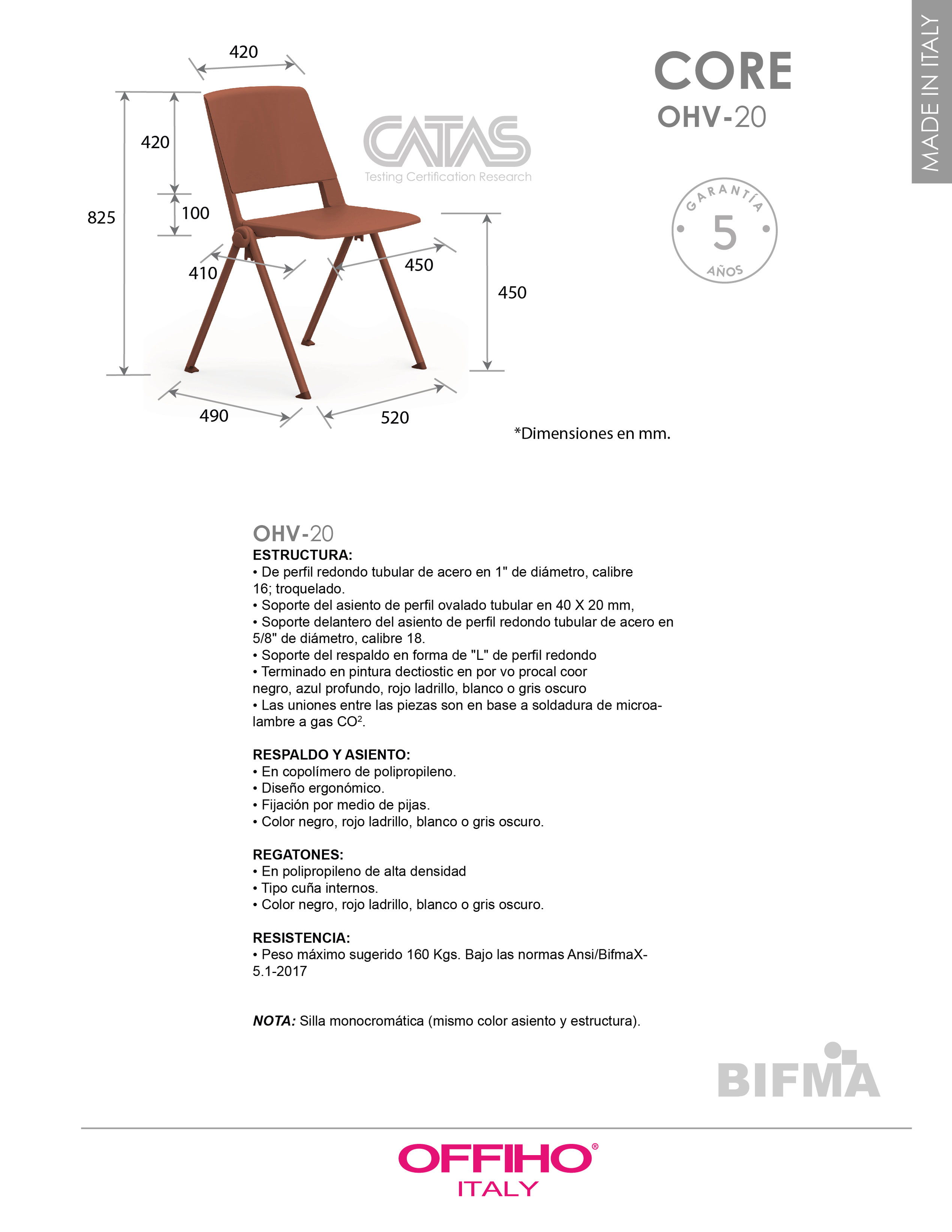estructura: de acero tubular de 1" de diámetro, calibre 16, con acabado en pintura epóxica (electrostática) color negro, blanco, rojo ladrillo o gris oscuro. respaldo y asiento: en dos piezas en polipropileno de alta resistencia y duración. color: negro, blanco, rojo ladrillo o gris oscuro. NOTA: Silla monocromática (mismo color asiento y estructura). resistencia: peso sugerido 160 kgs.