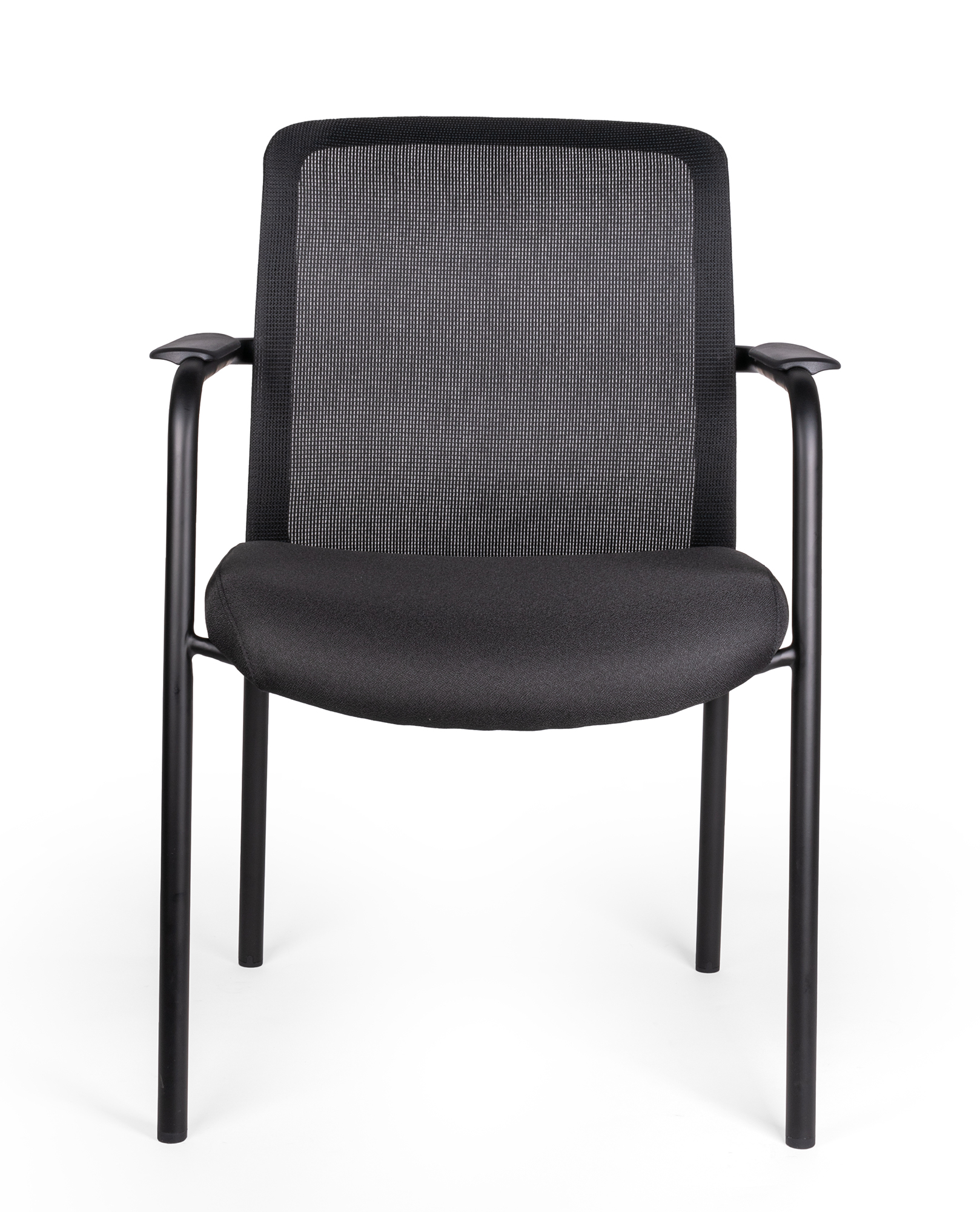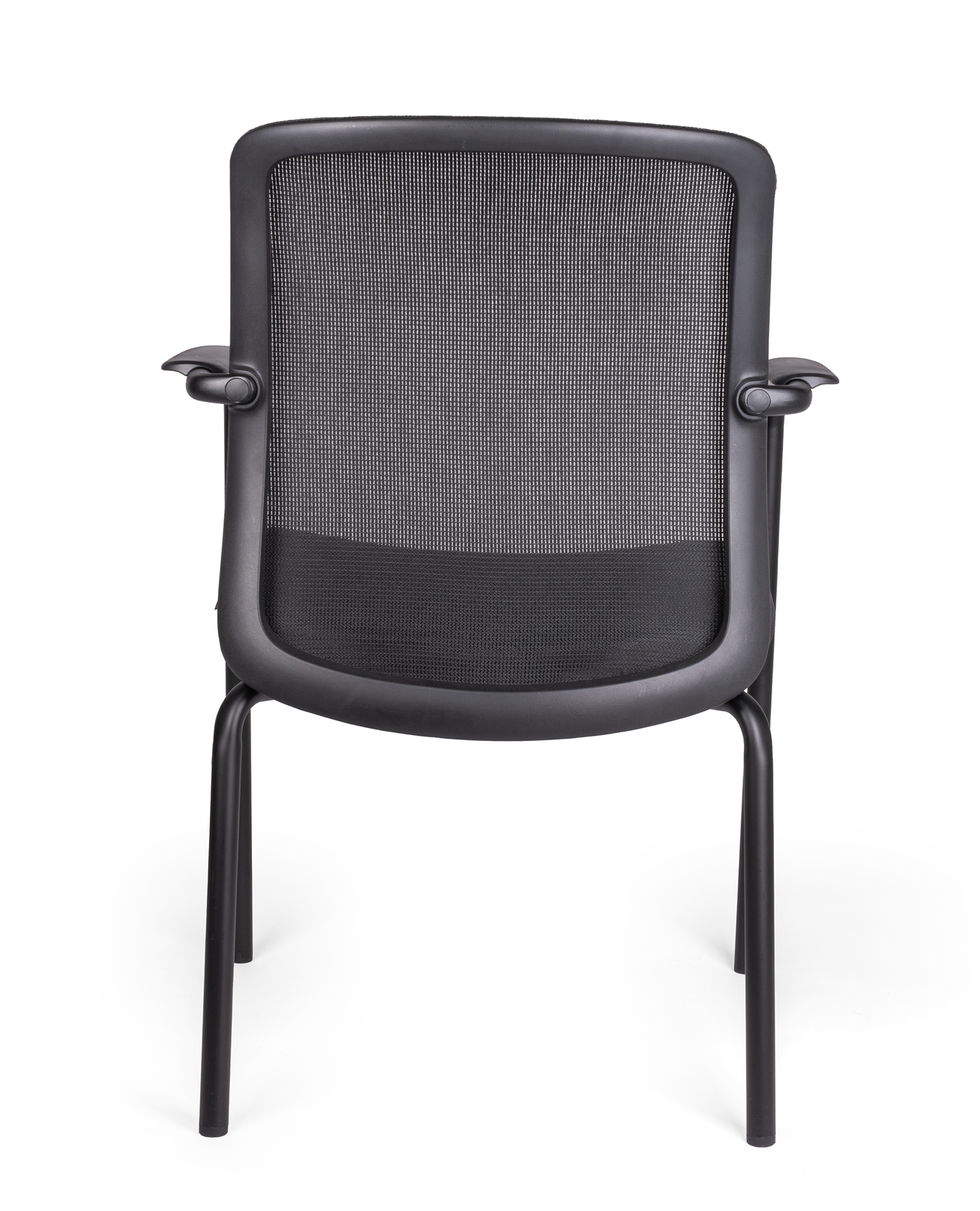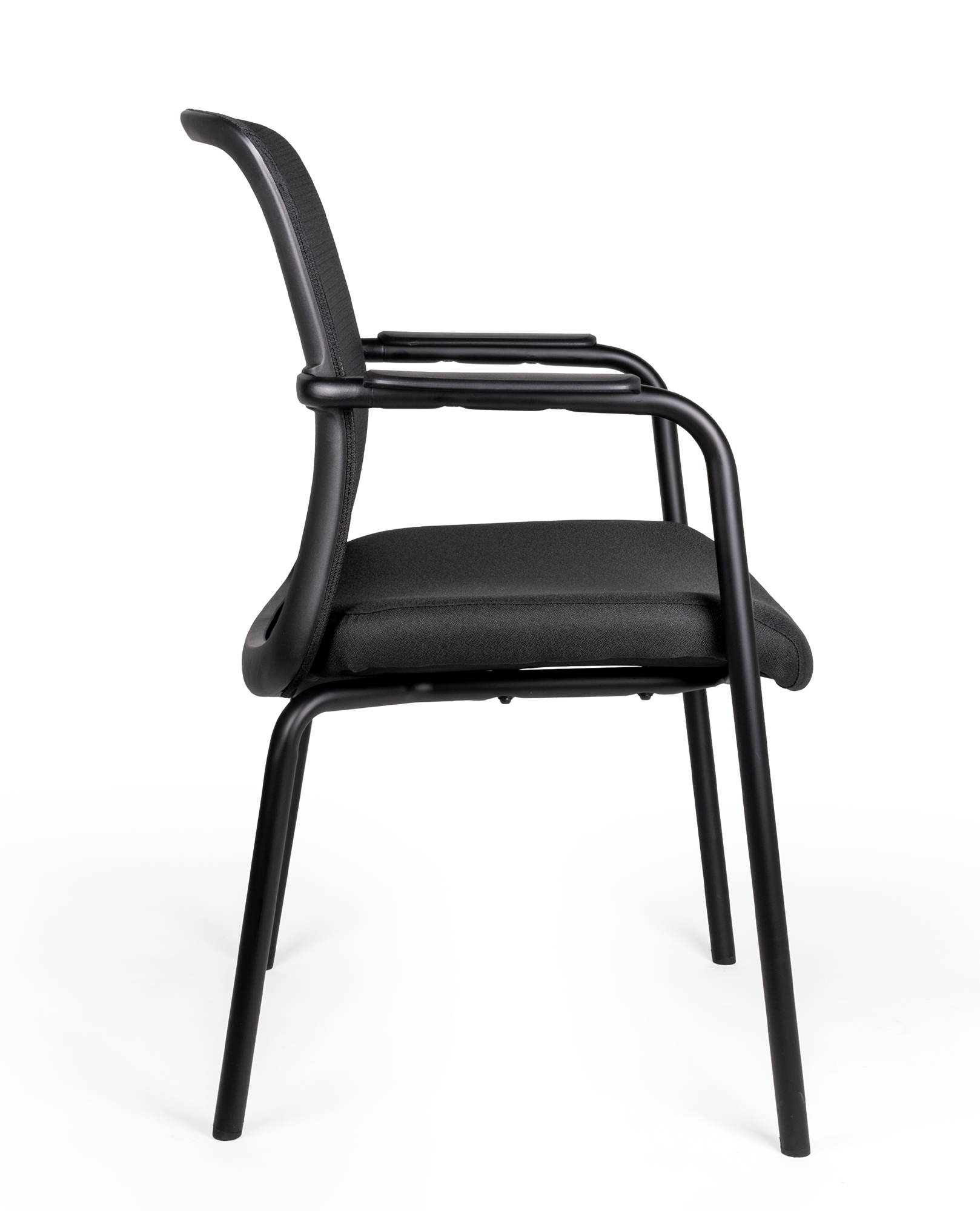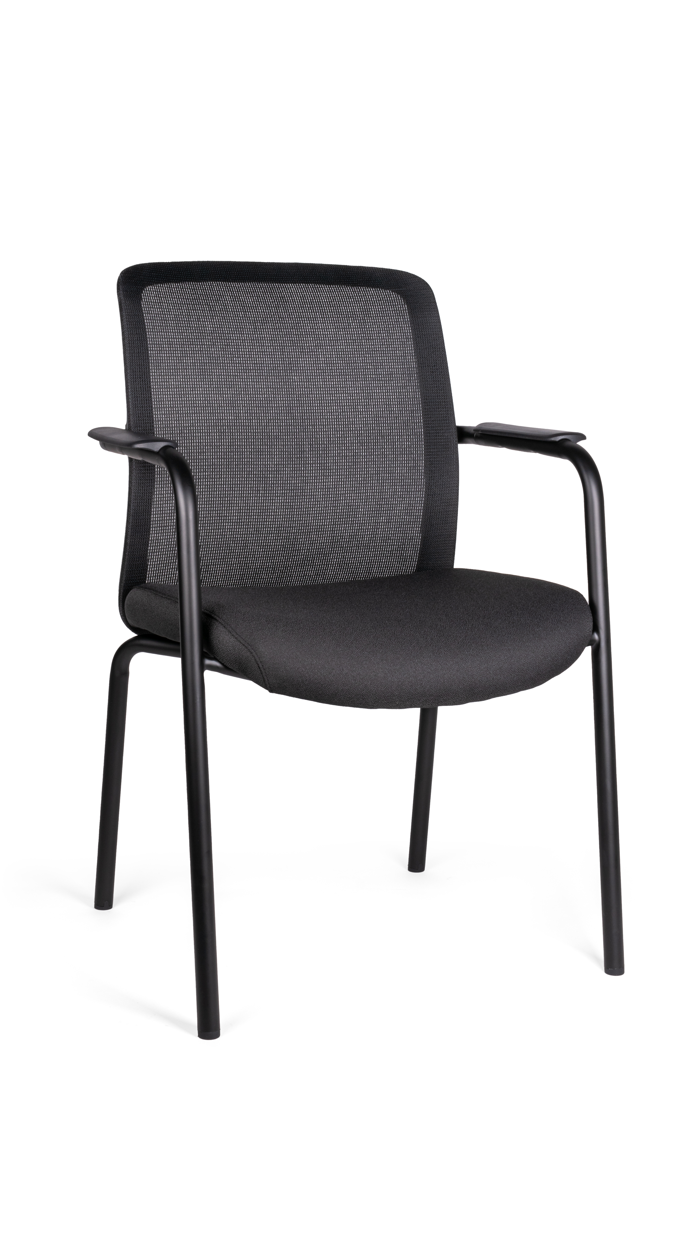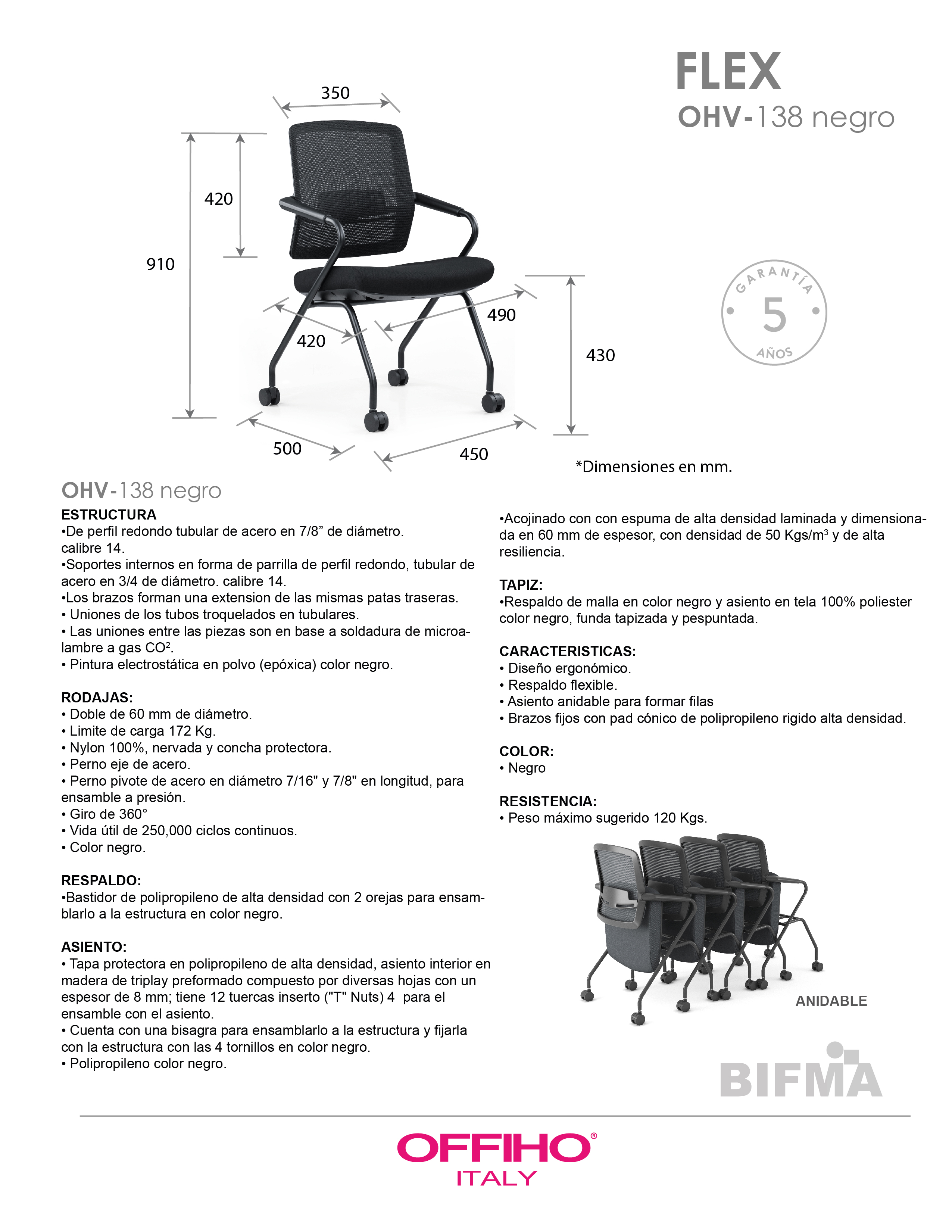 estructura: de perfil redondo tubular de acero con soportes internos en forma de parrilla. características: diseño ergonómico, brazos fijos con pad de polipropileno rígido alta densidad. brazos: color negro que forman una extension de las mismas patas traseras, uniones de los tubos troquelados en tubulares, las uniones entre las piezas son en base a soldadura de microalambre a gas. respaldo: bastidor de polipropileno de alta densidad con 2 ángulos de sujeción para ensamblarlo a la estructura en color negro. asiento: polipropileno color negro, asiento interior en madera de triplay y acojinado con espuma inyectada de 50 mm de espesor y densidad de 55kg/m3 de alta de resiliencia. tapiz: respaldo de malla y asiento en tela 100% poliéster color negro, funda tapizada y pespuntada. resistencia: peso sugerido 140 kgs.
