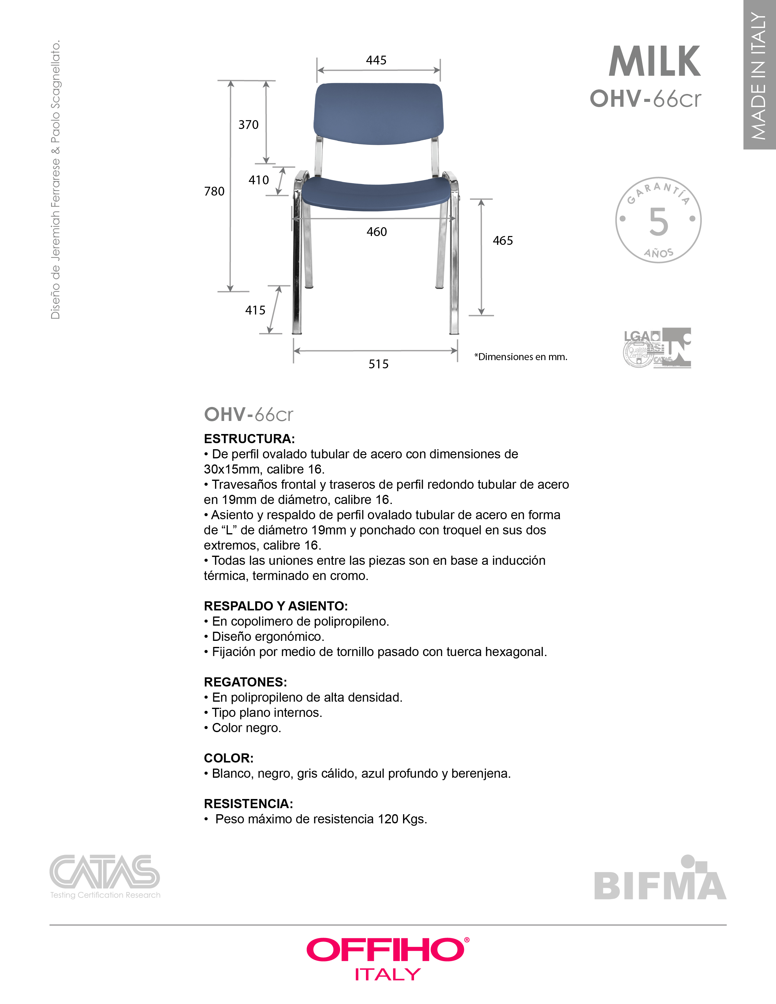 estructura: de acero tubular ovalado de 30 x 15 mm, calibre 16; travesaños de acero tubular redondo de 19 mm, calibre 16 y asiento y respaldo de acero tubular ovalado de 30 X 15 mm, calibre 16 con terminado en cromo. asiento y respaldo: en dos piezas en polipropileno de alta resistencia y duración. color: blanco, negro, gris cálido, azul profundo y berenjena. resistencia: peso sugerido 120 kgs. - Diseño de Jeremiah Ferrarese & Paolo Scagnellato