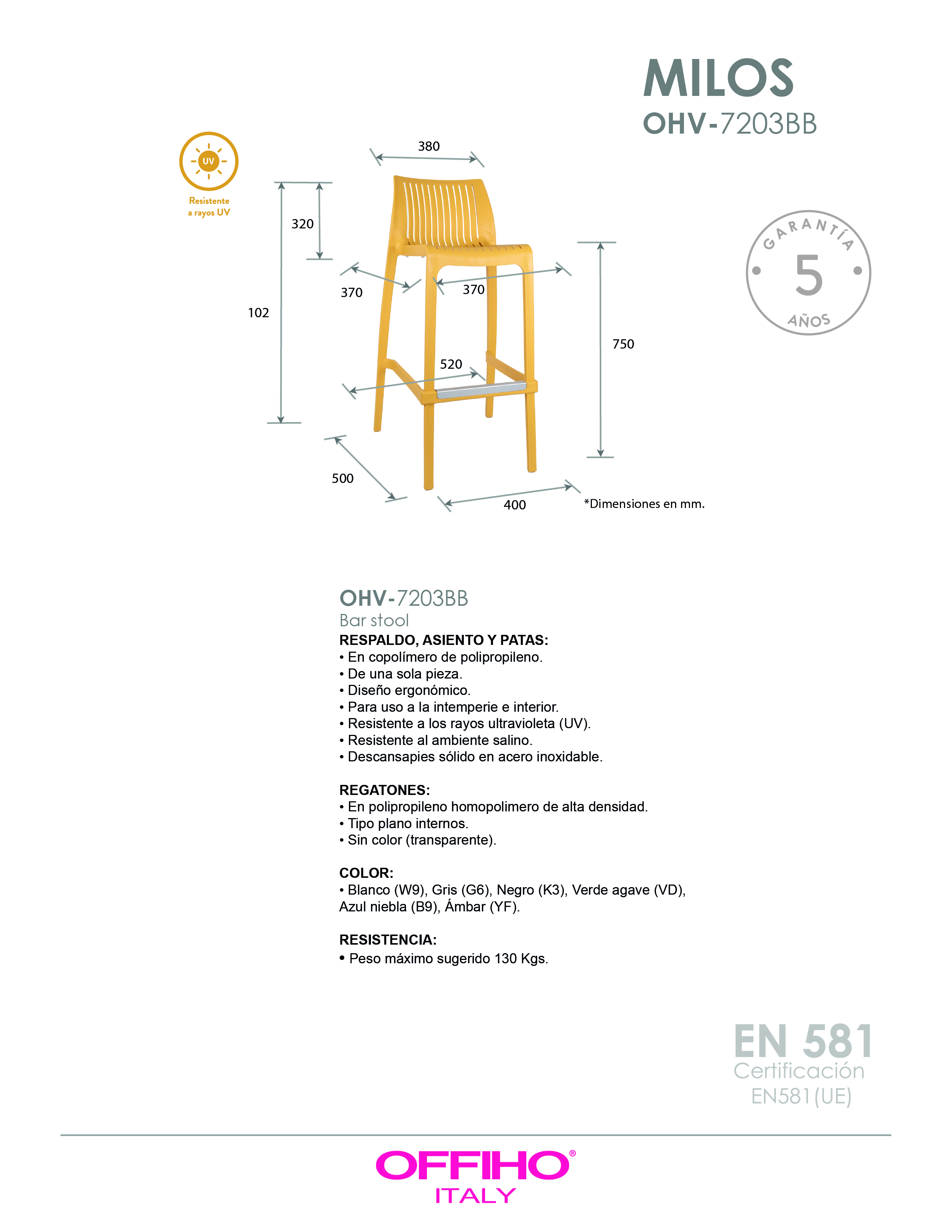 Patas, asiento y respaldo: de una sola pieza en polipropileno de alta resistencia y duración para intemperie, resistente a los rayos ultravioleta (UV) y al ambiente salino.