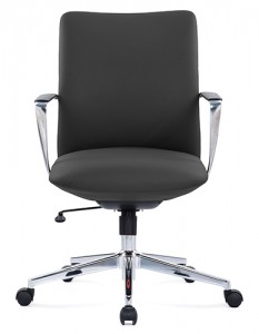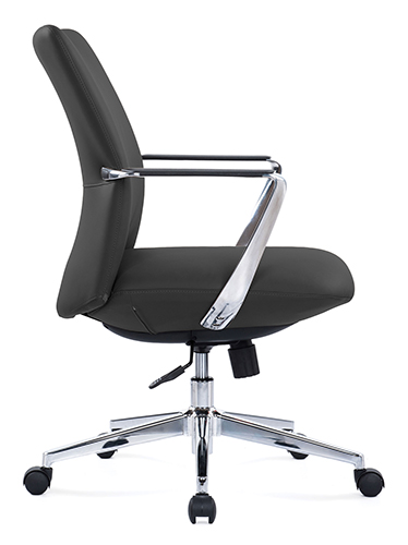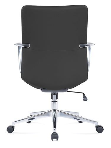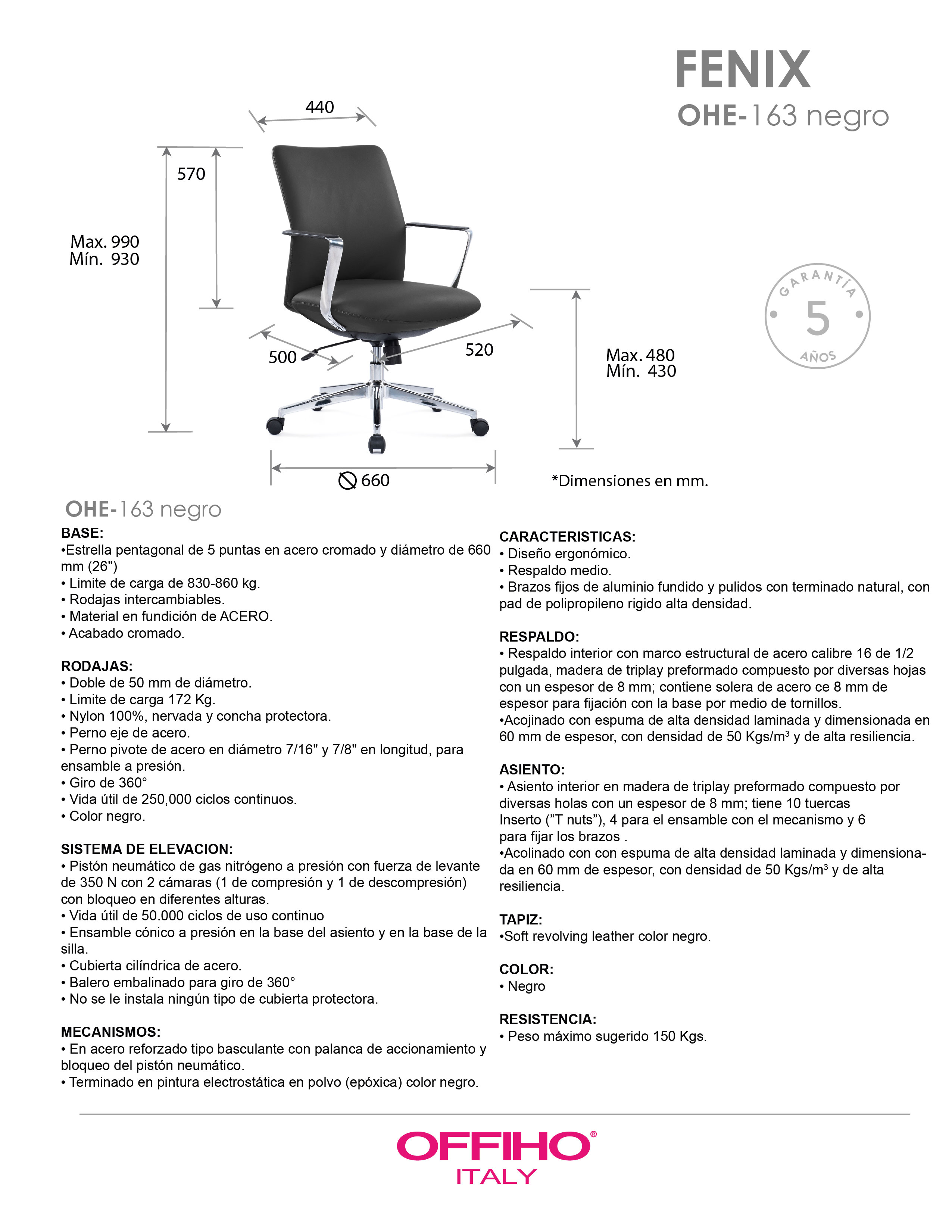 base: estrella de 5 puntas en acero fundido y cromado, rodajas tipo dual. elevación: por medio de pistón neumático que permite ajustar la altura del asiento. mecanismo: en solera de acero tipo basculante con sistema de reclinación y palanca de bloqueo, perilla de regulación de tensión para el sistema de reclinación y palanca de bloqueo para la inclinación del respaldo. brazos: de aluminio fundido y pulidos con terminado natural, con pad de polipropileno rígido de alta resistencia. respaldo: respaldo medio con estructura de acero y base de madera acojinado con hule espuma laminada flexible con densidad de 50 kgs/m³ y alta resiliencia. asiento: base de madera acojinado con hule espuma laminada flexible con densidad de 50 kgs/m³ y alta resiliencia. tapiz: en soft revolving leather de color negro. peso máximo de resistencia: 150 kgs. aproximadamente.