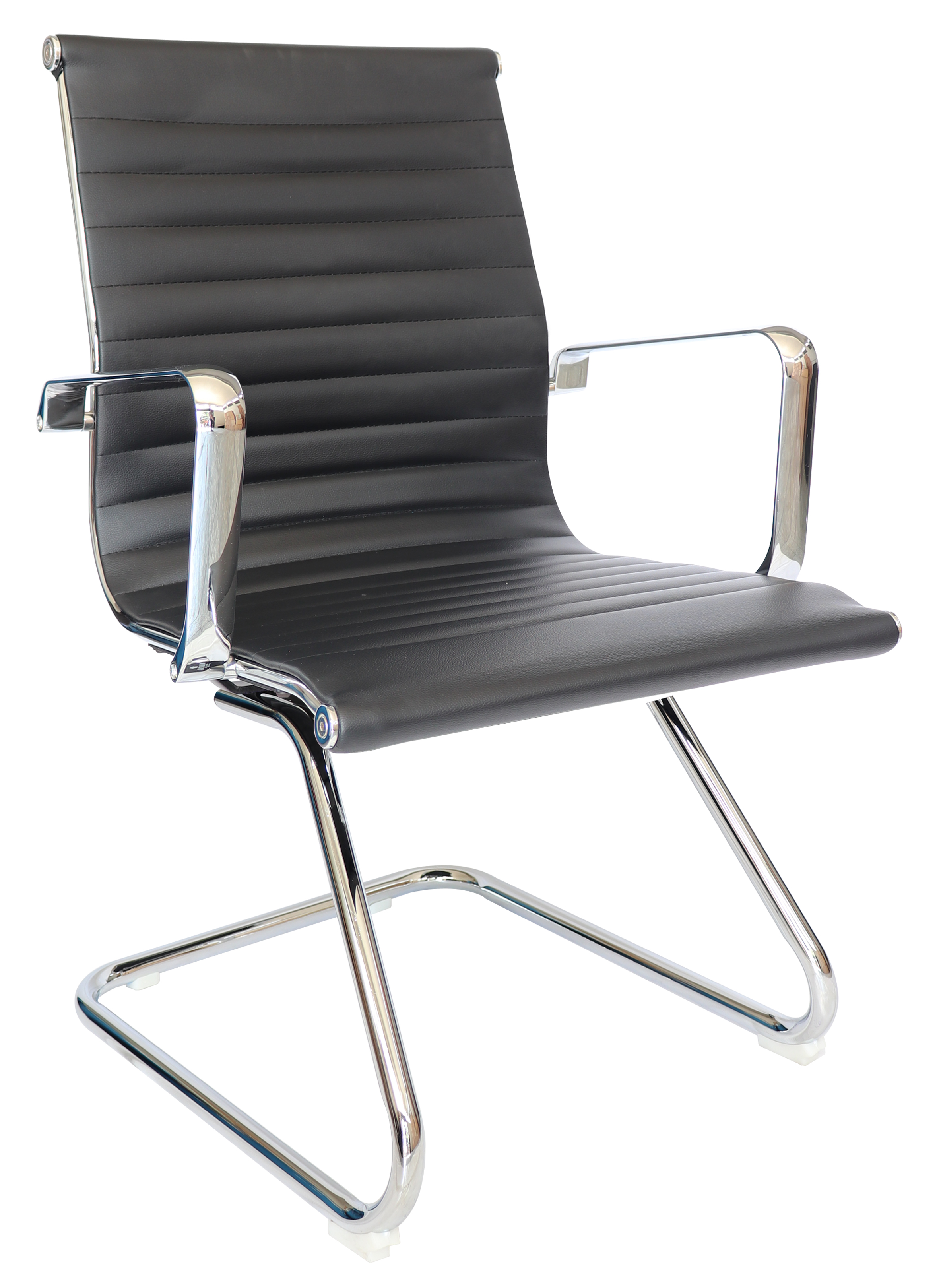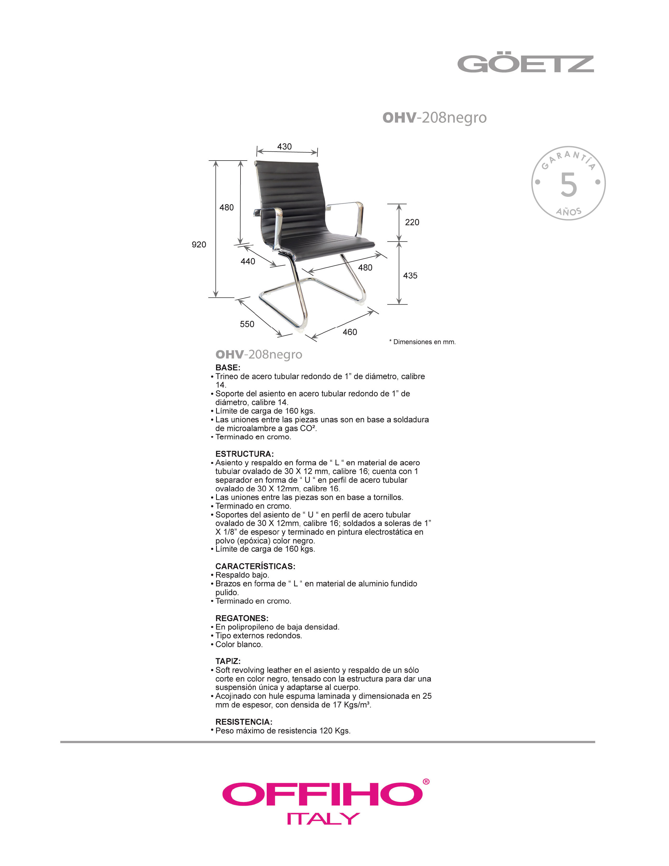 base: trineo de acero tubular redondo de 1" de diámetro, calibre 14; con terminado en cromo. asiento y respaldo: bajo de un sólo corte tensado con la estructura para dar una suspensión única y adaptarse al cuerpo tapizado en soft revolving leather acojinado con hule espuma laminada flexible de 17 kgs/m3 y alta resiliencia; toda la estructura es de acero tubular con terminado en cromo. brazos: de aluminio fundido y pulidos con terminado en cromo. color: negro. peso máximo de resistencia: 120 kgs.