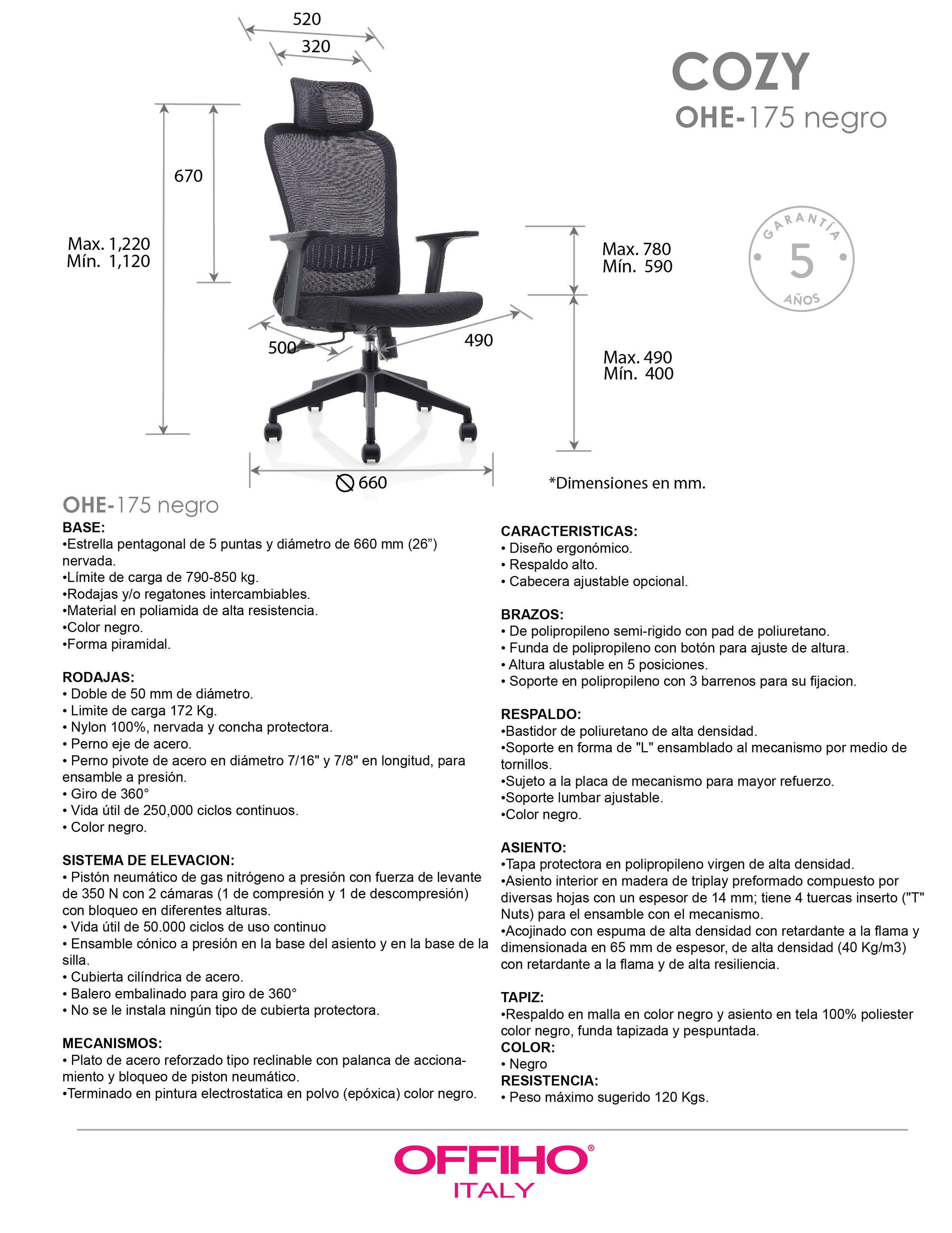 base: estrella de 5 puntas en poliamida, rodajas tipo dual. elevación: por medio de pistón neumático que permite ajustar la altura del asiento. mecanismo: plato de acero reforzado con sistema de reclinación y palanca de bloqueo, perilla de regulación de tensión para el sistema de reclinación. brazos: de polipropileno semi-rígido con pad de poliuretano, ajustables de 5 posiciones. respaldo: en malla de diseño ergonómico con soporte lumbar ajustable y cabecera ajustable. asiento: hule espuma laminado flexible con densidad de 40 kgs/m3 con retardante a la flama y alta resiliencia. tapiz: respaldo de malla de color negro y asiento en tela 100% POLIESTER COLOR NEGRO, FUNDA TAPIZADA Y PESPUNTADA. peso máximo de resistencia: 120 kgs.