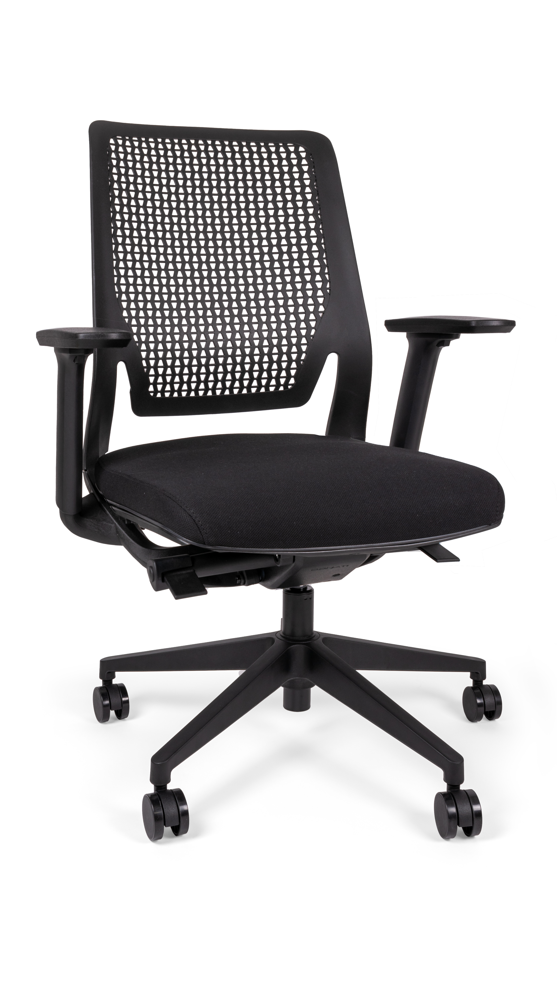base: estrella de 5 puntas en poliamida, rodajas tipo dual. elevación: por medio de pistón neumático que permite ajustar la altura del asiento. mecanismo: italiano Donati última generación de dos palancas, una con regulación de tensión y bloqueo de ajuste de altura y la otra para ajustar el sistema de reclinación en 3 posiciones tipo de rodilla articulado (knee-tilt) synchro (contacto permanente). brazos: de polipropileno semi-rígido con pad de poliuretano, ajustables de 5 posiciones. respaldo: en polipropileno reticulado con ventilación y soporte lumbar. asiento: hule espuma de poliuretano inyectado con densidad de 55 kgs/m³ con retardante a la flama y alta resiliencia. tapiz: asiento en tela 100% POLIESTER COLOR NEGRO, FUNDA TAPIZADA Y PESPUNTADA. NO SE PUEDE RETAPIZAR. peso máximo de resistencia: 140 kgs.