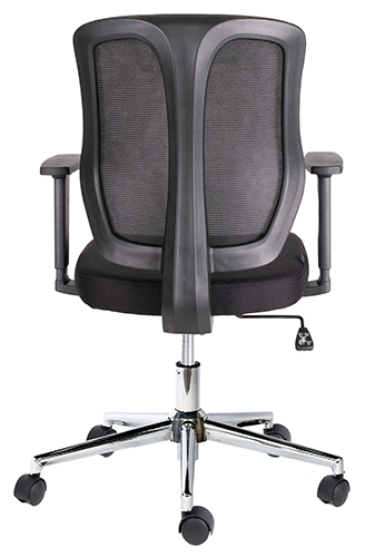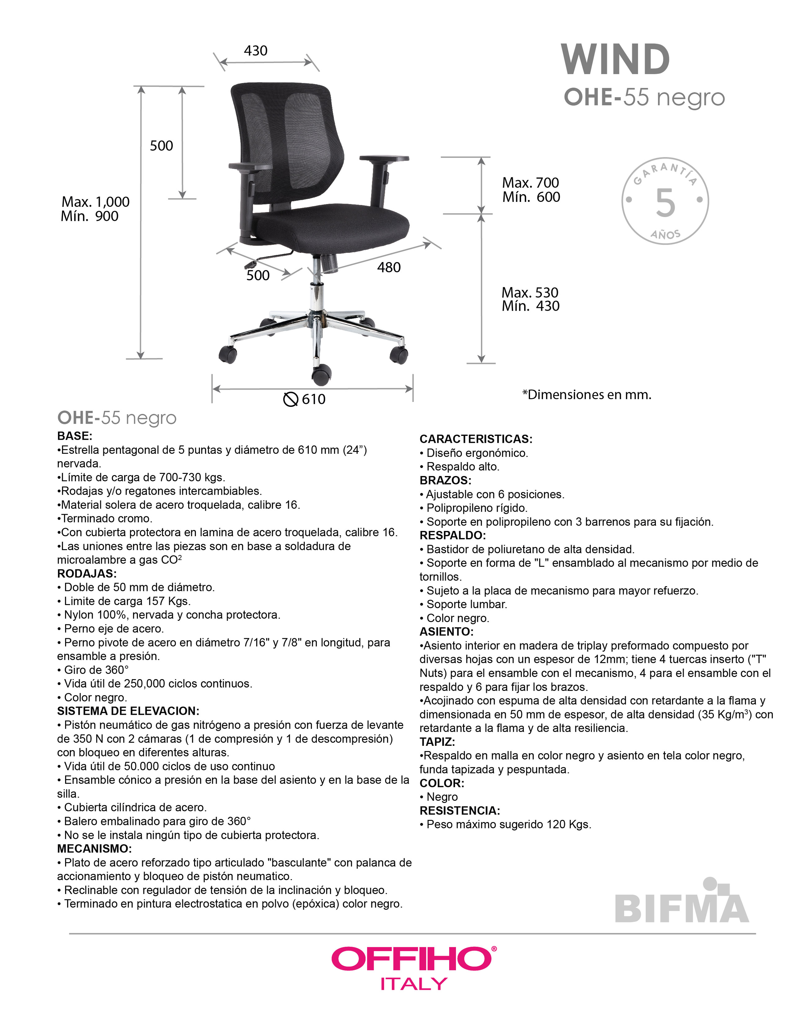 base: estrella de 5 puntas en acero cromado, rodajas tipo dual. elevación: por medio de pistón neumático que permite ajustar la altura del asiento. mecanismo: plato de acero reforzado con sistema de reclinación y palanca de bloqueo, perilla de regulación de tensión para el sistema de reclinación. brazos: de polipropileno rígido ajustables de 6 posiciones. respaldo: en malla de diseño ergonómico. asiento: hule espuma laminado flexible con retardante a la flama, densidad de 35 kgs/m3 y alta resiliencia. tapiz: respaldo de malla de color negro y asiento en tela 100% POLIESTER COLOR NEGRO, FUNDA TAPIZADA Y PESPUNTADA. peso máximo de resistencia: 120 kgs. aproximadamente.